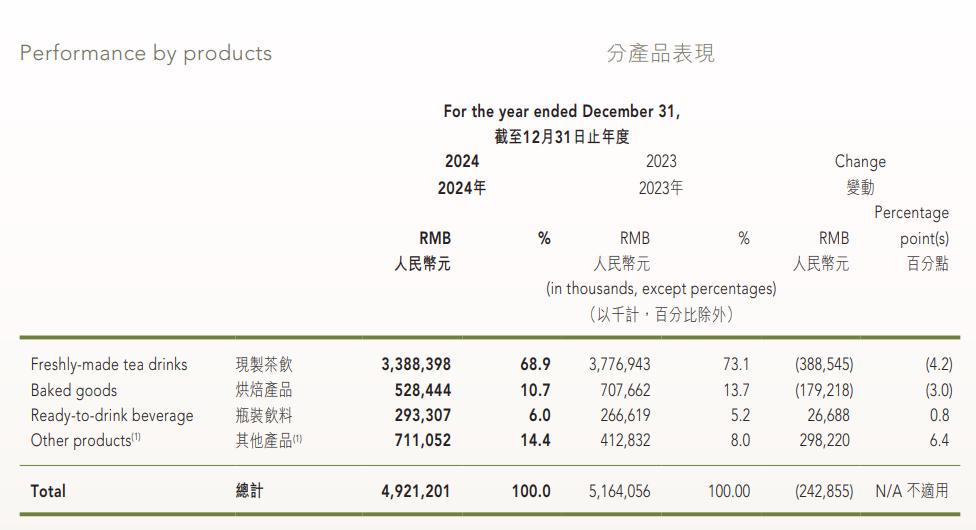 但是,值得一提的是,2024年,奈雪来自现制茶饮和烘焙产品的收入,相较2023年均在下滑,来自瓶装饮料和其他产品的收入则实现了同比增长,分别为0.8%和6.4%。