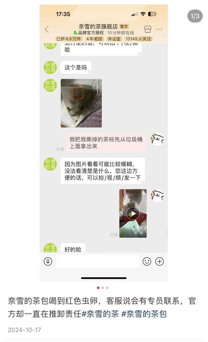 不过,这种模式也存在弊端,比如质量失控。事实上,不仅是奈雪,多家新茶饮品牌生产的茶包都曾被曝出食品安全问题。此前,蜜雪冰城茶包被曝喝出多条虫子曾引发关注。据媒体报道,一消费者在蜜雪冰城的茶包中发现了数只虫子和虫卵,感到十分恶心。社交平台上,多位网友表示在茶颜悦色的茶包中发现了头发等异物。