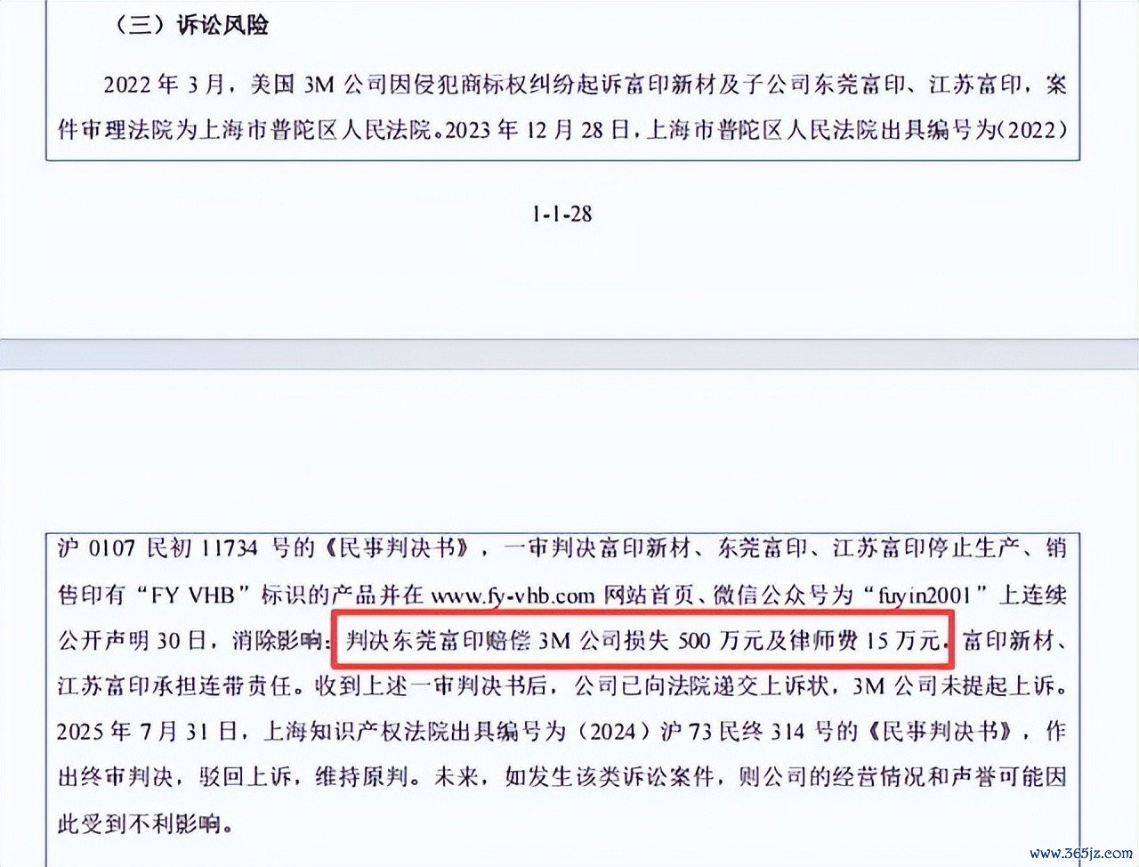 2023年12月,上海市普陀区人民法院判令富印新材及其子公司停止侵权,赔偿损失500万元。富印新材不服一审判决,于2024年1月8日提起二审上诉,2025年4月8日,经过审理,最终法院驳回富印新材及其子公司上诉,维持原判,累计赔偿损失及律师费达515万元。